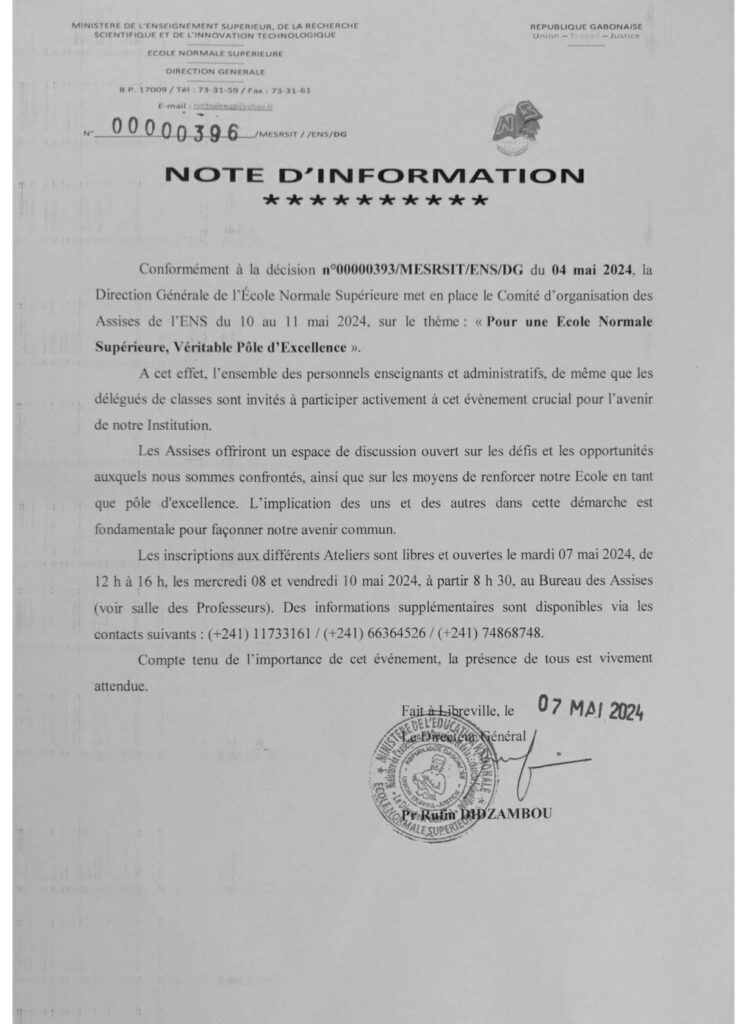 Les 10 et 11 mai 2024, l’Ecole Normale Supérieure (ENS) ose tenir ses prétentieuses « Assises » sous le thème pompeux : « Pour une école normale supérieure, véritable pôle d’excellence ». Ce cirque semble être orchestré par le Ministère de l’Enseignement Supérieur, de la Recherche Scientifique et de l’Innovation Technologique. C’est le contraire qui étonnerait. Alors que les organisateurs de cette mascarade prétendent offrir un semblant de débat sur les défis et les opportunités de l’institution, ainsi que sur les moyens de renforcer l’Ecole en tant que prétendu pôle d’excellence, il est évident que toute la procédure pour un tel événement a été délibérément bafouée par le Pr Ruffin Didzambou, le directeur général de cette institution, et dans une moindre mesure par le Pr Hervé Ndoume Essingone, le sinistre ministre de l’Enseignement Supérieur, de la Recherche Scientifique et de l’Innovation Technologique, parachuté le 9 septembre 2023 par le président de la Transition.