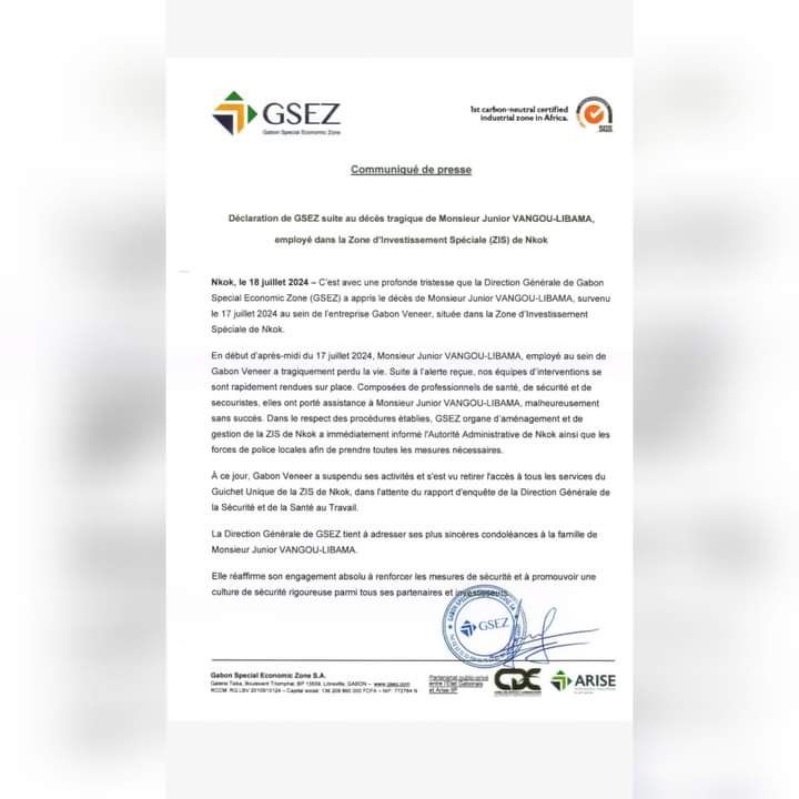 Dans une déclaration de presse dont notre Rédaction a obtenu copie, la Direction Générale de GSEZ a tenu à adresser ses sincères condoléances à la famille de sieur Junior Vangou-Libama, suite au décès tragique de ce dernier le jeudi 18 juillet courant au sein de l’entreprise Gabon Veneer, établie dans la Zone d’Investissement Spéciale de Nkok.