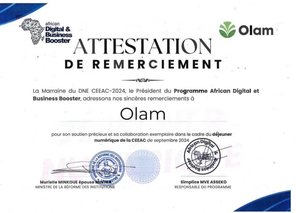 Le Président Directeur Général de la Digital Business School a remis une attestation de reconnaissance au Directeur Général d’Olam monsieur Christophe EYI, au nom du ministre de la Réforme du Gabon. Ce geste vient saluer l’engagement de l’entreprise aux côtés des autorités gabonaises dans leur quête d’un développement durable par la formation des jeunes aux compétences numériques.