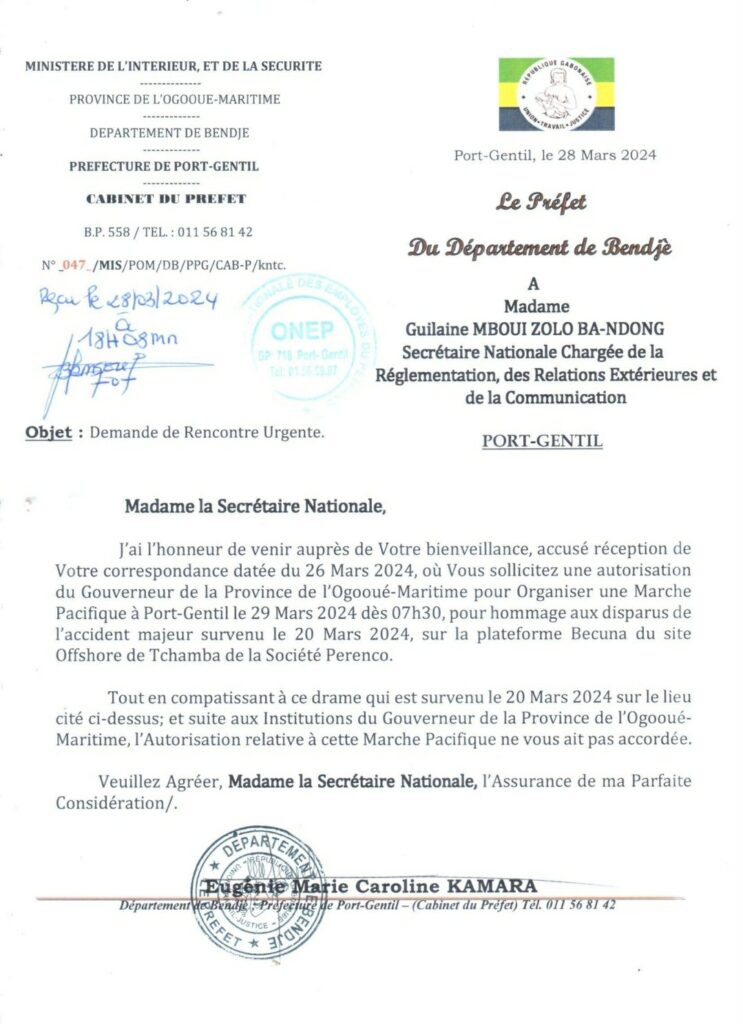 C’est par un courrier daté du 28 mars et dont nous avons obtenu copie, que le préfet du Département de Bendjé a indiqué à l’Organisation Nationale des Employés du Pétrole (ONEP) l’interdiction de conduire une marche pacifique en mémoire des disparus de l’accident du 20 mars 2024.