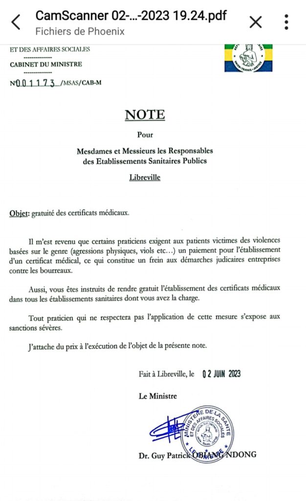 Dans une circulaire datée du vendredi 2 juin courant, adressée aux responsables des établissements sanitaires publics, Dr Guy Patrick Obiang Ndong, le ministre de la Santé et des Affaires Sociales a menacé de sanctionner sévèrement tous ceux prendront la latitude de faire payer aux victimes des violences basées sur le genre l’établissement de leurs certificats médicaux.