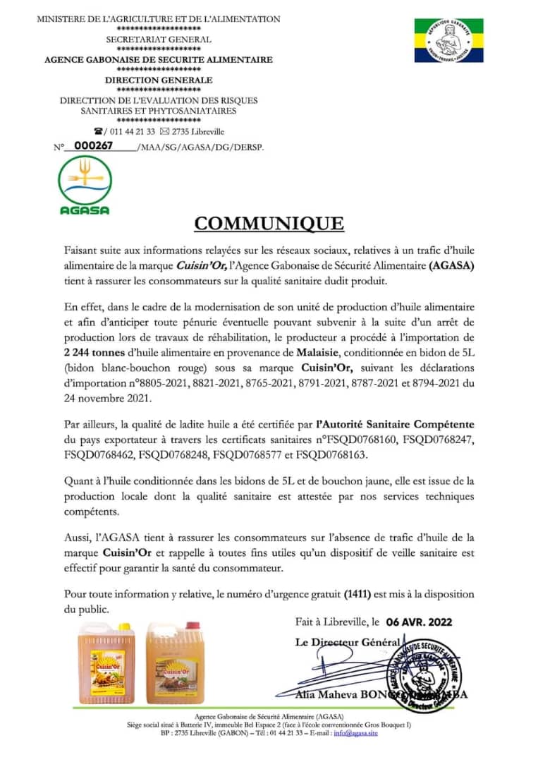 En réaction aux informations relayées sur les réseaux sociaux relatives au trafic d’huile alimentaire de la marque Cuisin’or, l’Agence gabonaise de sécurité alimentaire (AGASA) a souhaité rassurer les consommateurs sur la qualité dudit produit, qui reste la même et ne saurait être ternie par des fakenews.