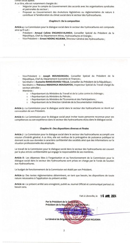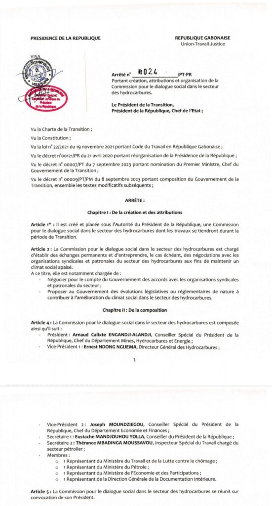 Faisant suite à son entretien avec les principaux acteurs de l’Organisation Nationale des Employés du Secteur Pétrolier (ONEP), intervenu le 23 février 2024, le président de la Transition, le général de Brigade Brice Clotaire Oligui Nguema a par arrêté N°024/PT-PR daté du mardi 16 avril courant, procédé à la mise en place d’une commission pour le dialogue social dans le secteur des Hydrocarbures.