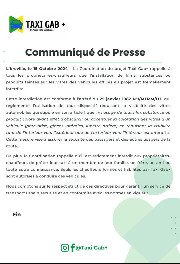 Ces directives, rappelées dans un contexte de multiplication des incidents, visent à garantir un transport urbain sécurisé, en conformité avec les normes en vigueur. Taxi Gab+ appelle donc tous les chauffeurs à respecter scrupuleusement ces règles pour éviter de nouveaux problèmes.