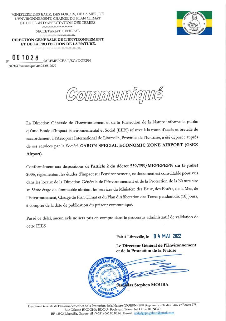 Par un communiqué daté du lundi 4 mai 2022 et dont notre Rédaction a obtenu copie, la Direction générale de l’environnement et de la protection de la nature (DGEPN) a informé du dépôt dans ses locaux, sise au 5e étage de l’immeuble abritant les services du Ministère des Eaux, des forêts, de la mer, de l’environnement chargé du Plan climat et du plan d’affectation des terres ; de l’étude d’impact environnemental et social (EIES) diligentée par la Gabon special economic zone airport (GSEZ Airport).
